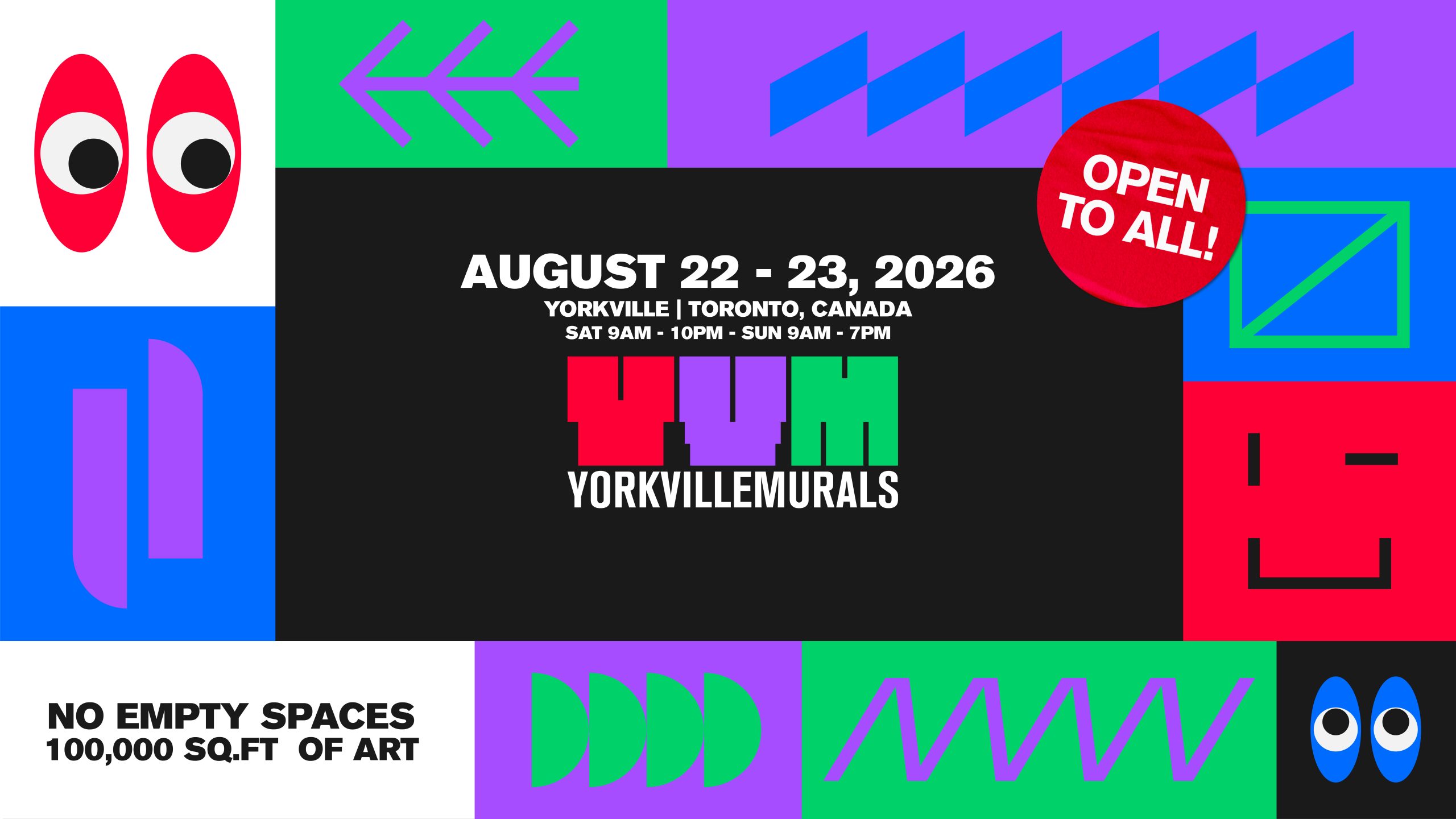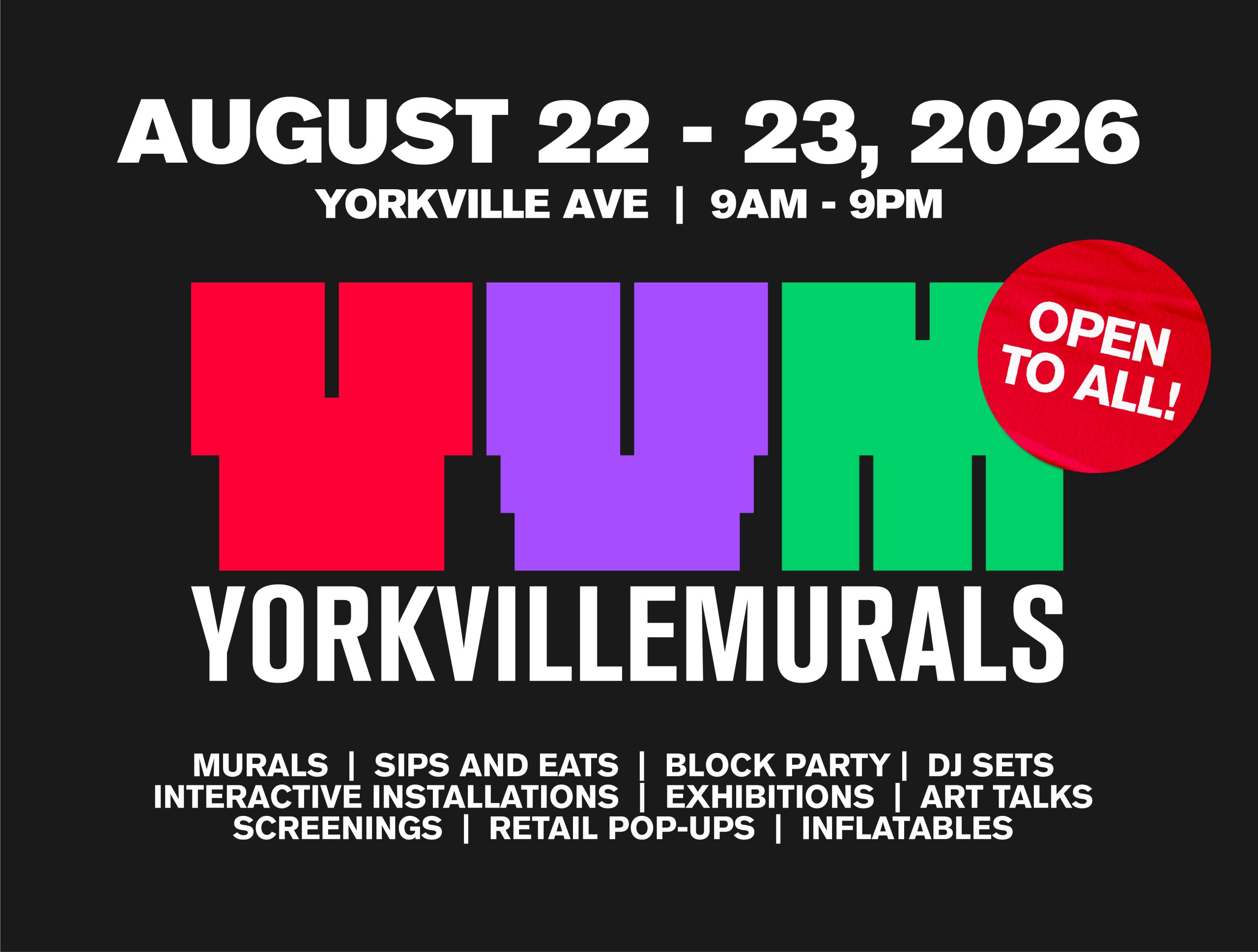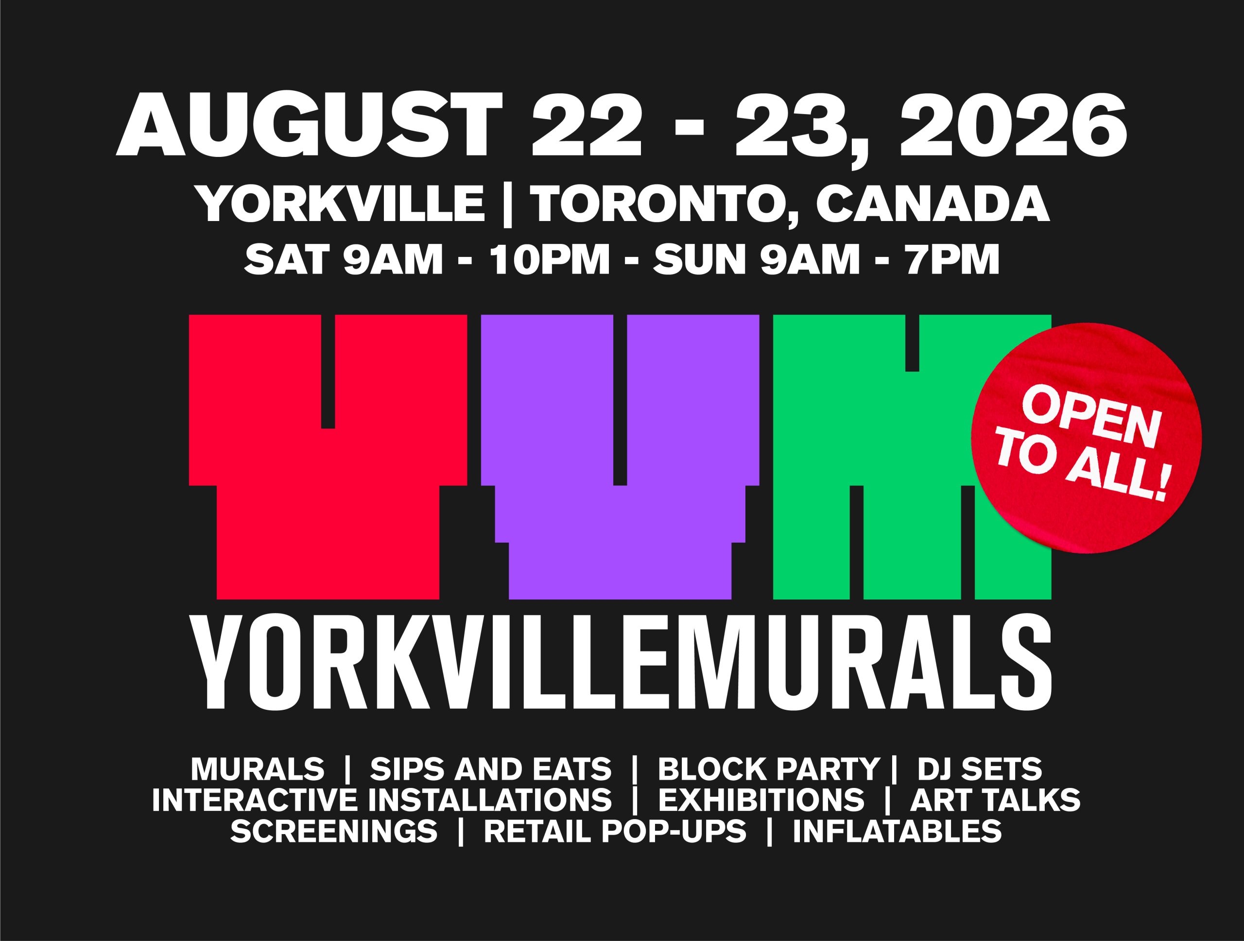 Toronto’s most dynamic art and muralism festival returns from August 22–23, 2026 with the third edition of its theme, No Empty Spaces. Yorkville Murals transforms Yorkville Avenue—stretching from Bellair Street to Hazelton Avenue—into a vibrant, interactive cultural playground.